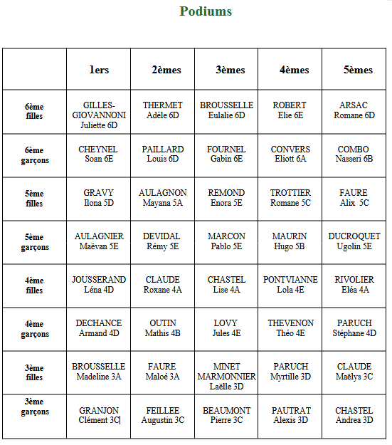Podiums du cross du collège